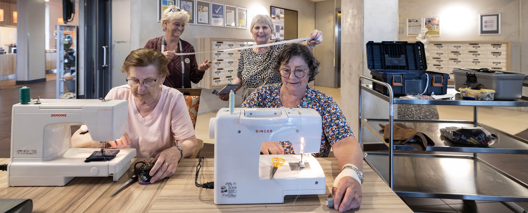 Een rits die hapert, een zoompje dat loslaat of een knoop die van de broek gesprongen is. Kleine mankementen, maar bijzonder lastig als je het zelf niet meer kunt verhelpen. Aan de kinderen vragen? Die hebben in dit digitale tijdperk vaak twee linkerhanden als het gaat om het ‘ouderwetse verstelwerk’. Dus zijn bewoners elke maand weer blij als ze zien dat in de hal, in de buurt van het biljart, de naaimachines van de vrijwilligers weer zoemen. “Het is een vaste activiteit geworden, die écht voldoet in een behoefte”, zegt Willeke van Veen (71), één van de vier naaisters.