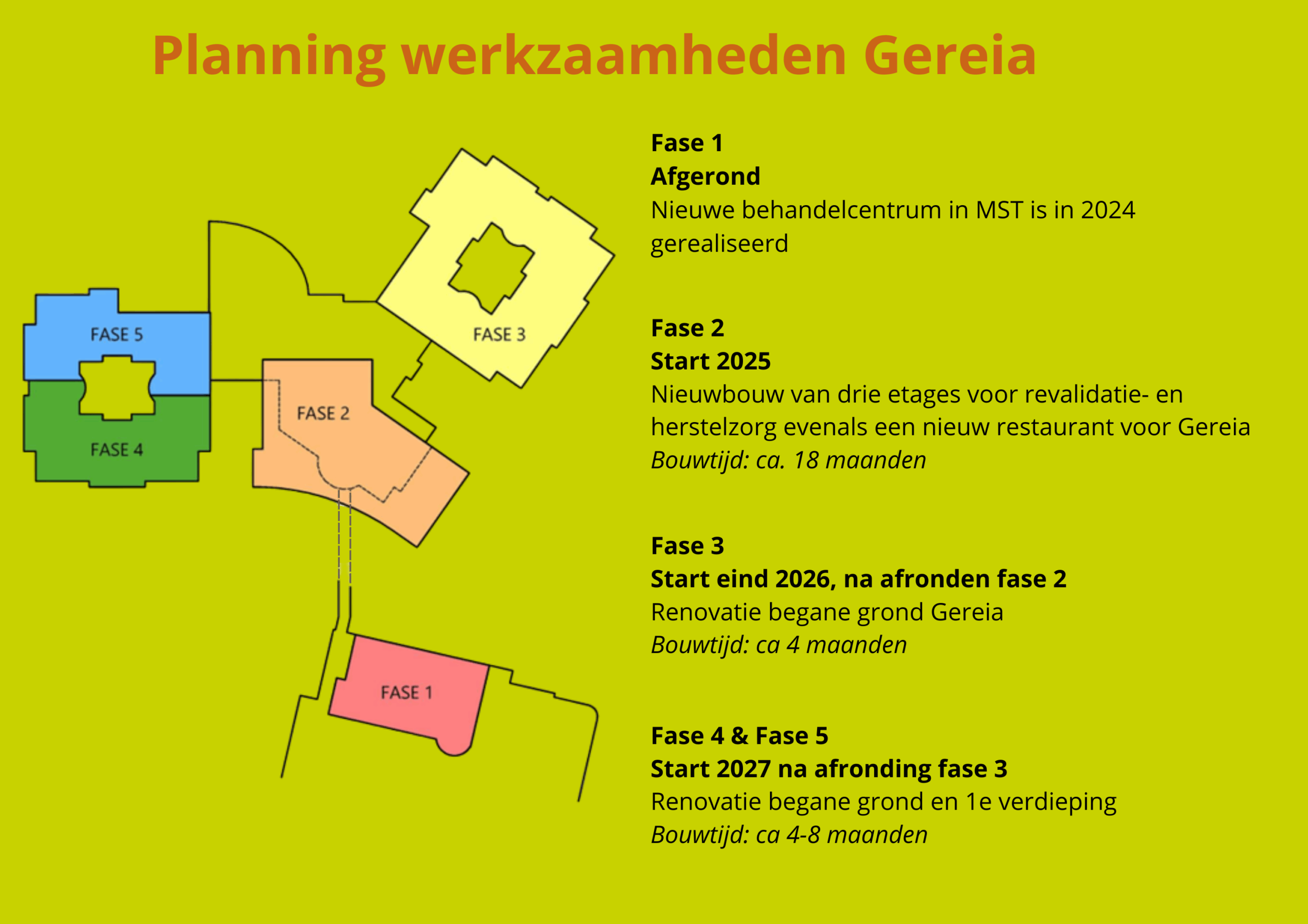 In 2025 begint de nieuwbouw aan de zijde van de busbaan. Na de afronding van de nieuwbouw volgt de renovatie van drie verblijfsafdelingen van Gereia. Dit meerjarentraject beslaat in totaal drie jaar.
