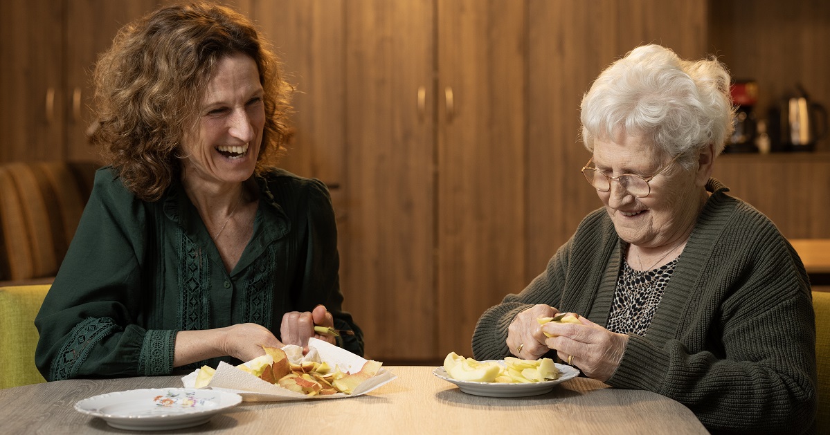 Dochters Esther en Ellen bakken elke maand rond de honderd pannenkoeken voor de bewoners van Gravenstate. “Pannenkoeken bakken deed mama vroeger ook voor ons. We maken het gezellig en zetten de piratenzender aan. Mama schilt de appels en papa eet ook mee. Er gaan meestal zes pakken meel doorheen. De geur van de pannenkoeken dringt door tot in de huiskamer, zodat iedereen ervan kan genieten. Het is inmiddels voor iedereen een waardevolle traditie geworden. En het ontzorgt de zorg.”