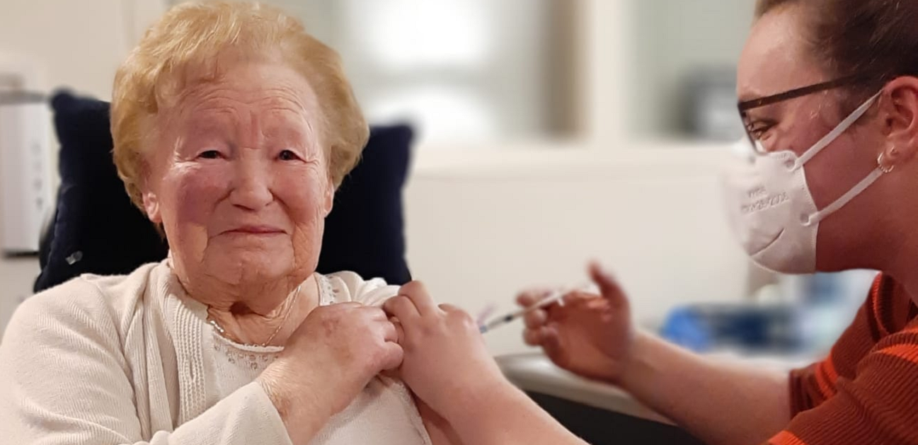 Een van de eerste bewoonsters die vandaag een vaccinatie heeft ontvangen is de 93-jarige mevrouw Oude Roelink uit Oldenzaal. “Het geeft me een goed gevoel”, aldus de bewoonster van woonzorgcentrum de Zonnestraal in Oldenzaal.