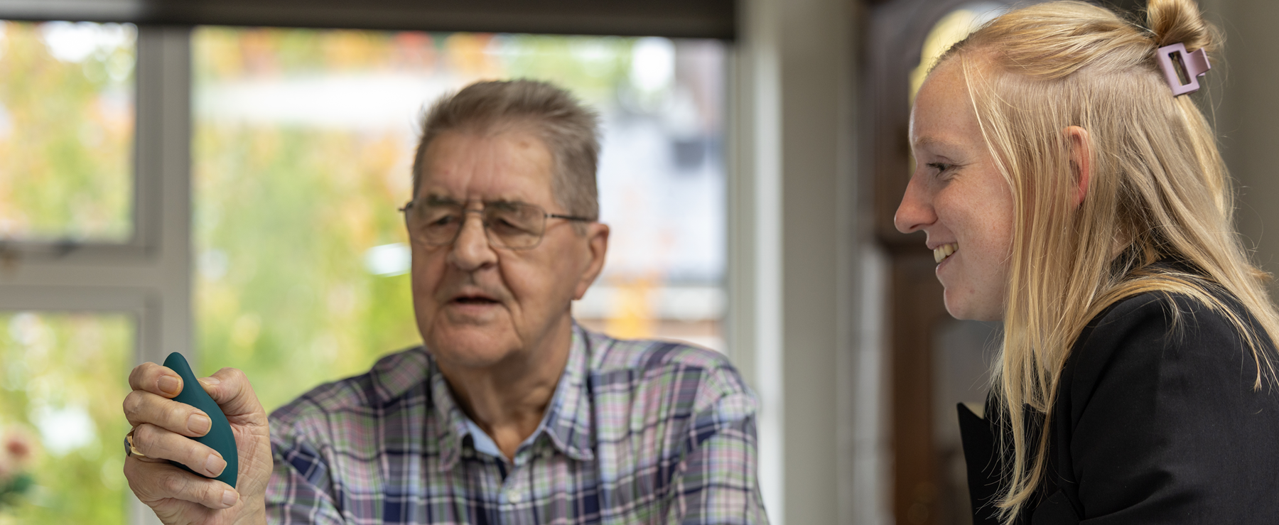 Beide hulpmiddelen zijn nog relatief nieuw. Om te ontdekken hoe ze in de praktijk werken, probeert Lisa ze soms zelf uit. Haar oma, die in woonzorgcentrum Franciscus in Ootmarsum woont, is daarbij haar proefpersoon. “Mijn oma heeft geen optimale ademhaling, dus zo kwam ik bij de Moonbird,” vertelt Lisa. “Ze dacht in het begin wel: wat is dit nou? Maar na een paar keer merkte ze echt verschil, haar ademhaling werd rustiger en beter.”