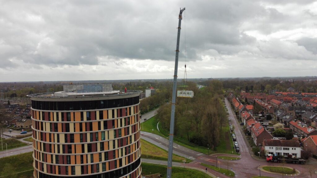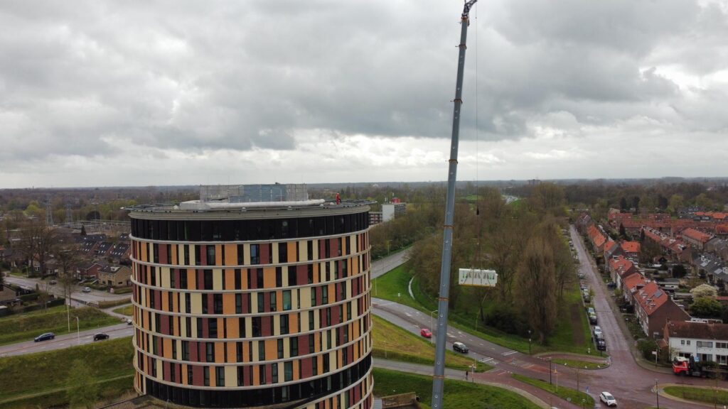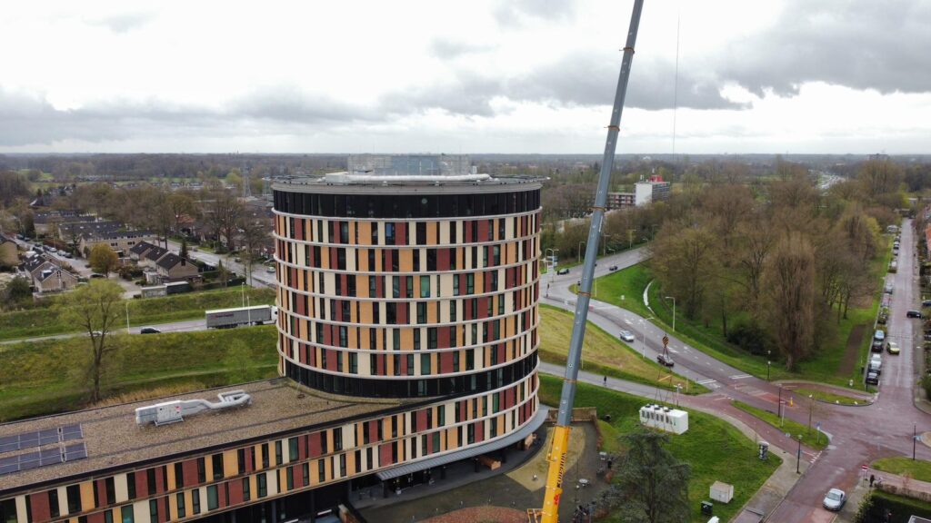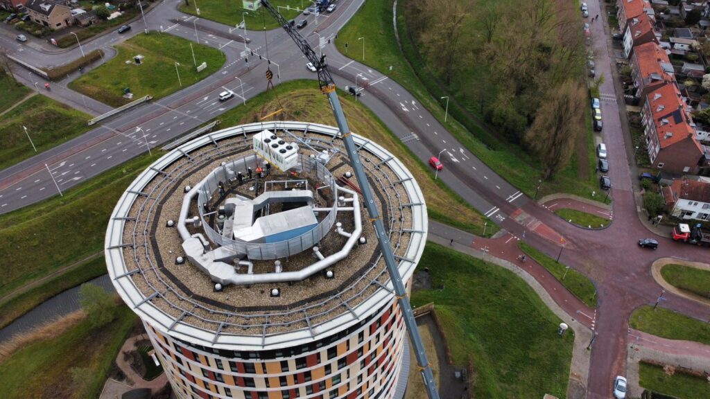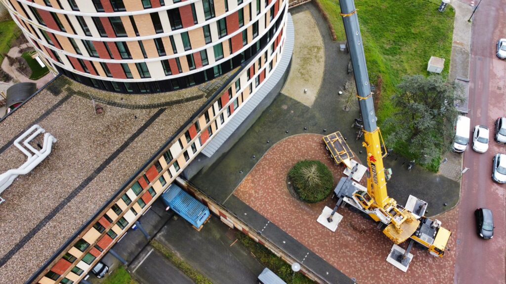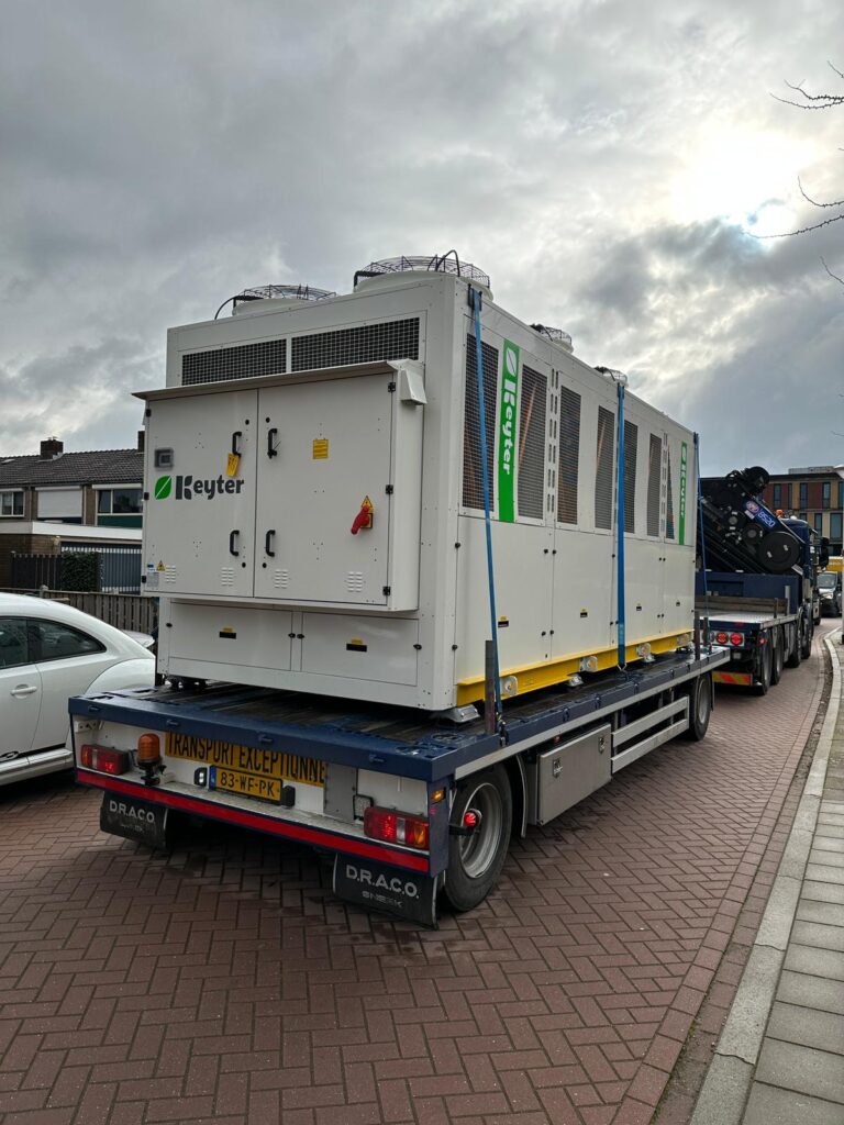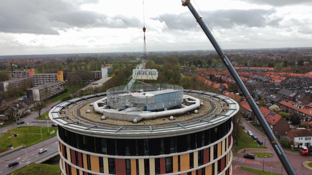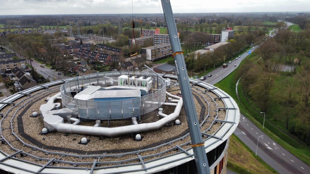 Met een enorme kraan hebben we deze week de oude koelmachine van locatie de Polbeek laten vervangen door een energiebesparende warmtepomp. Dit levert niet alleen een aanzienlijke reductie in gasverbruik op, maar als bonus ook enkele mooie plaatjes: